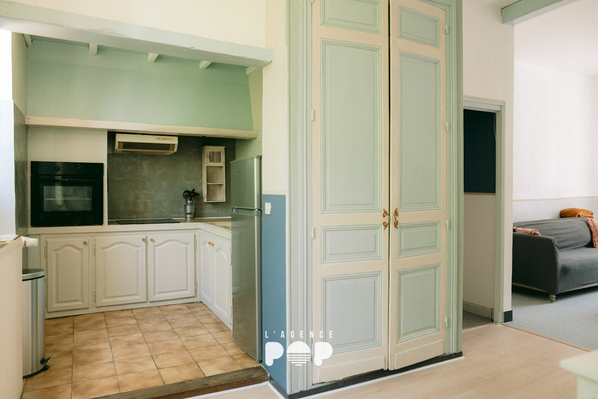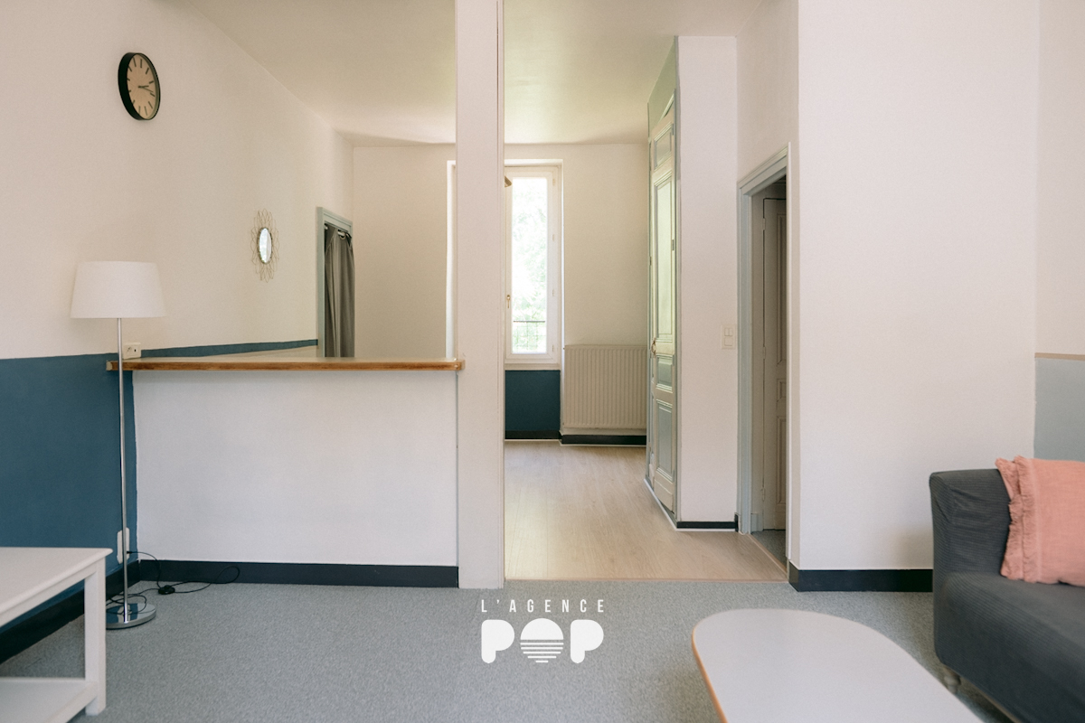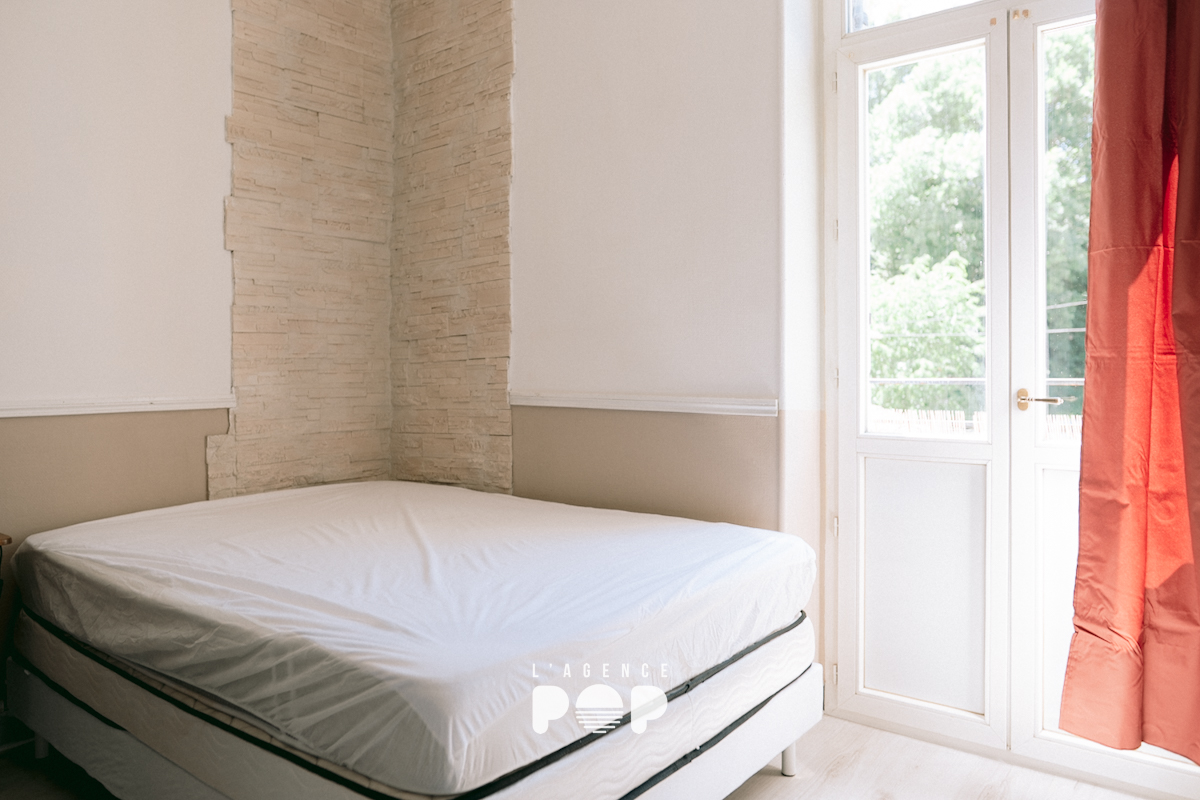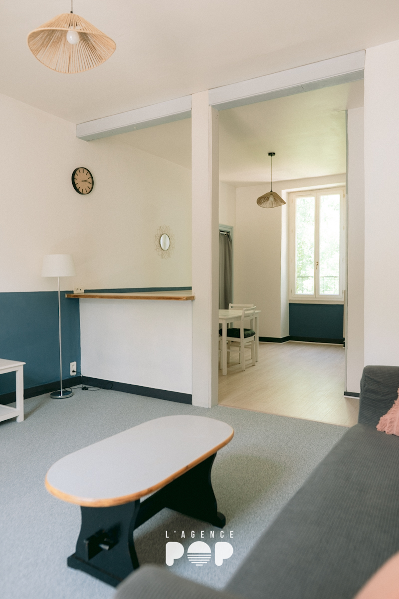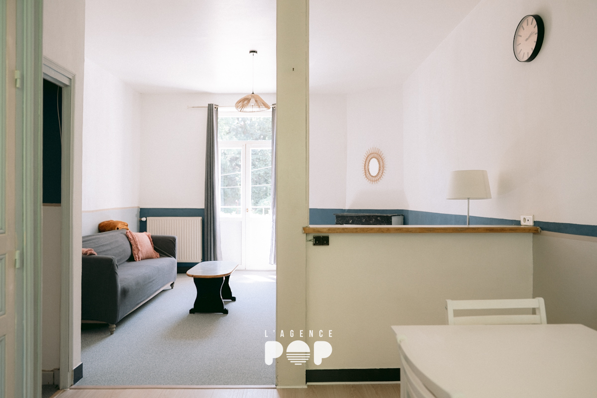 L’appartement s’ouvre sur une entrée qui dessert un séjour double lumineux avec cuisine ouverte, aménagée et entièrement équipée pour votre confort quotidien. Cet espace de vie donne accès à un balcon côté rue, partagé avec la chambre, parfait pour profiter d’un café au soleil ou d’un moment de détente.