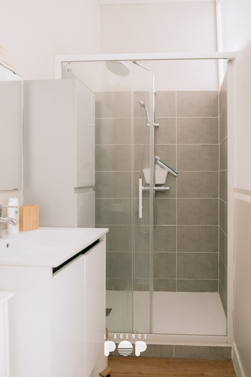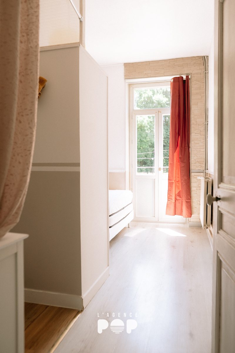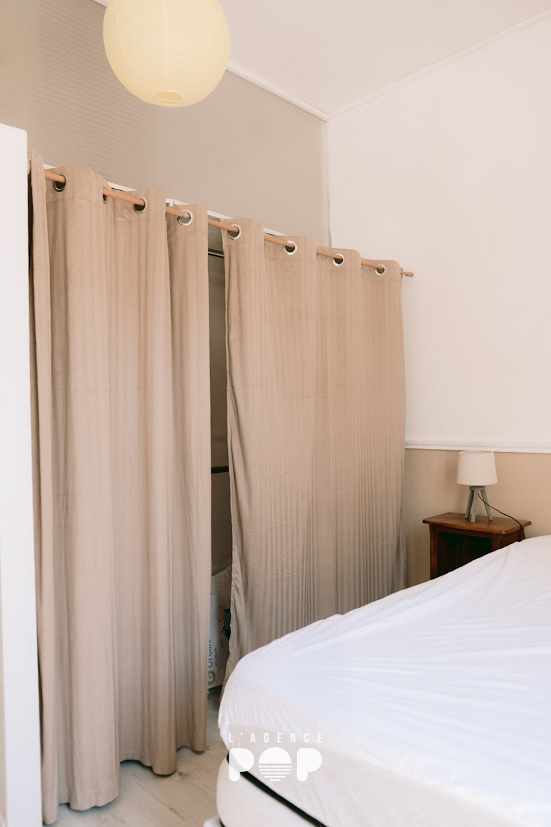 La chambre, spacieuse et équipée de rangements, communique directement avec une salle d’eau rénovée. Les WC sont séparés, pour plus de praticité.