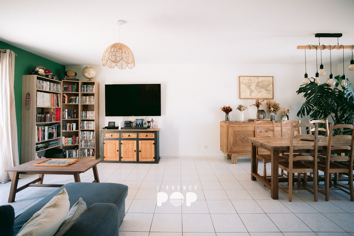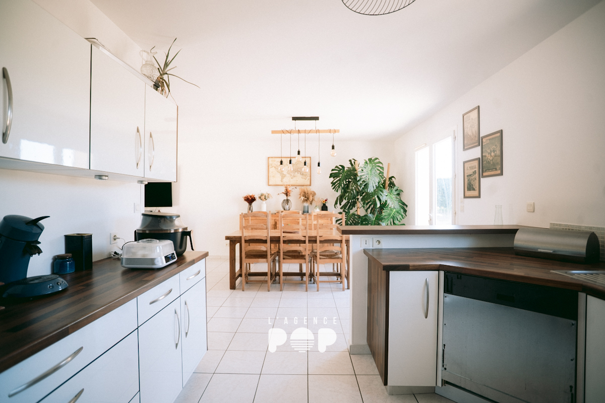 Construite en 2008 et récemment remise au goût du jour, elle développe 95,78 m2 habitables pensés pour un quotidien confortable et fonctionnel. Dès l’entrée avec placard, on découvre une belle pièce de vie en L, à la fois spacieuse et conviviale, permettant d’aménager facilement un espace salon et un coin repas. La cuisine ouverte, aménagée et équipée, s’intègre parfaitement à cet ensemble et se prolonge par un cellier, discret et très pratique au quotidien.