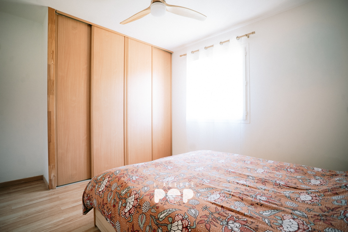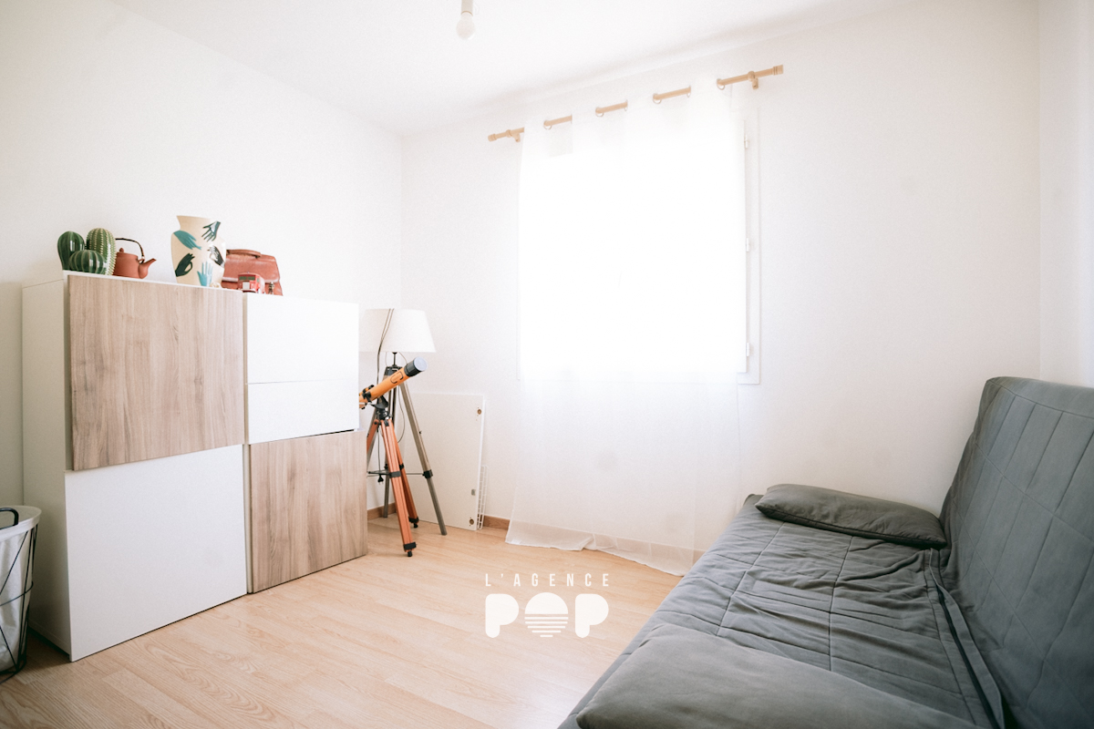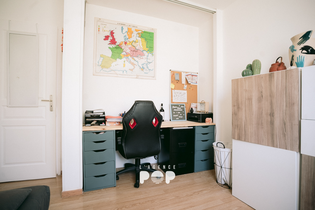 La partie nuit, bien séparée, accueille trois chambres avec rangements, dont une aujourd’hui aménagée en bureau. Une salle d’eau récemment rénovée et un WC indépendant complètent cet espace.