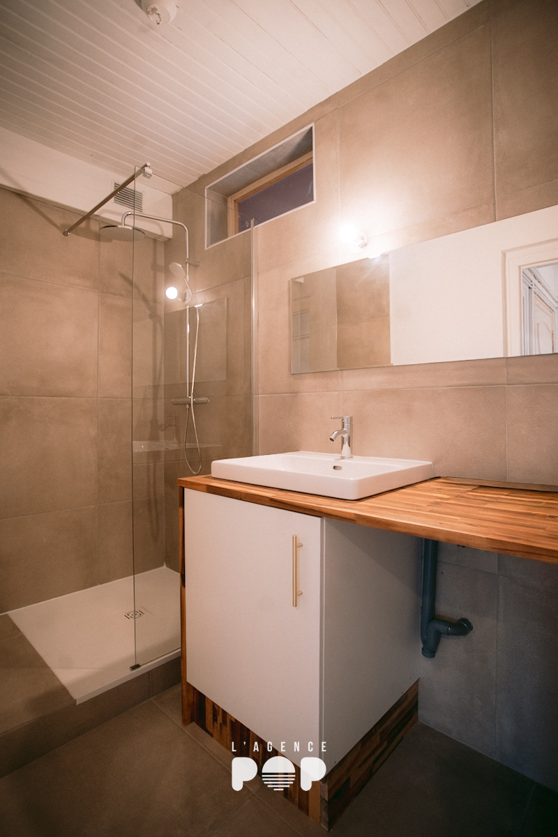 En poursuivant la visite dans le sens des aiguilles d’une montre, l’appartement dévoile ensuite un WC indépendant, une salle d’eau moderne, puis un séjour lumineux bénéficiant d’une large baie vitrée côté rue, apportant une belle luminosité naturelle tout au long de la journée. Depuis le séjour, on accède à la seconde chambre, idéale pour une chambre principale, un bureau ou une chambre d’amis selon les besoins.